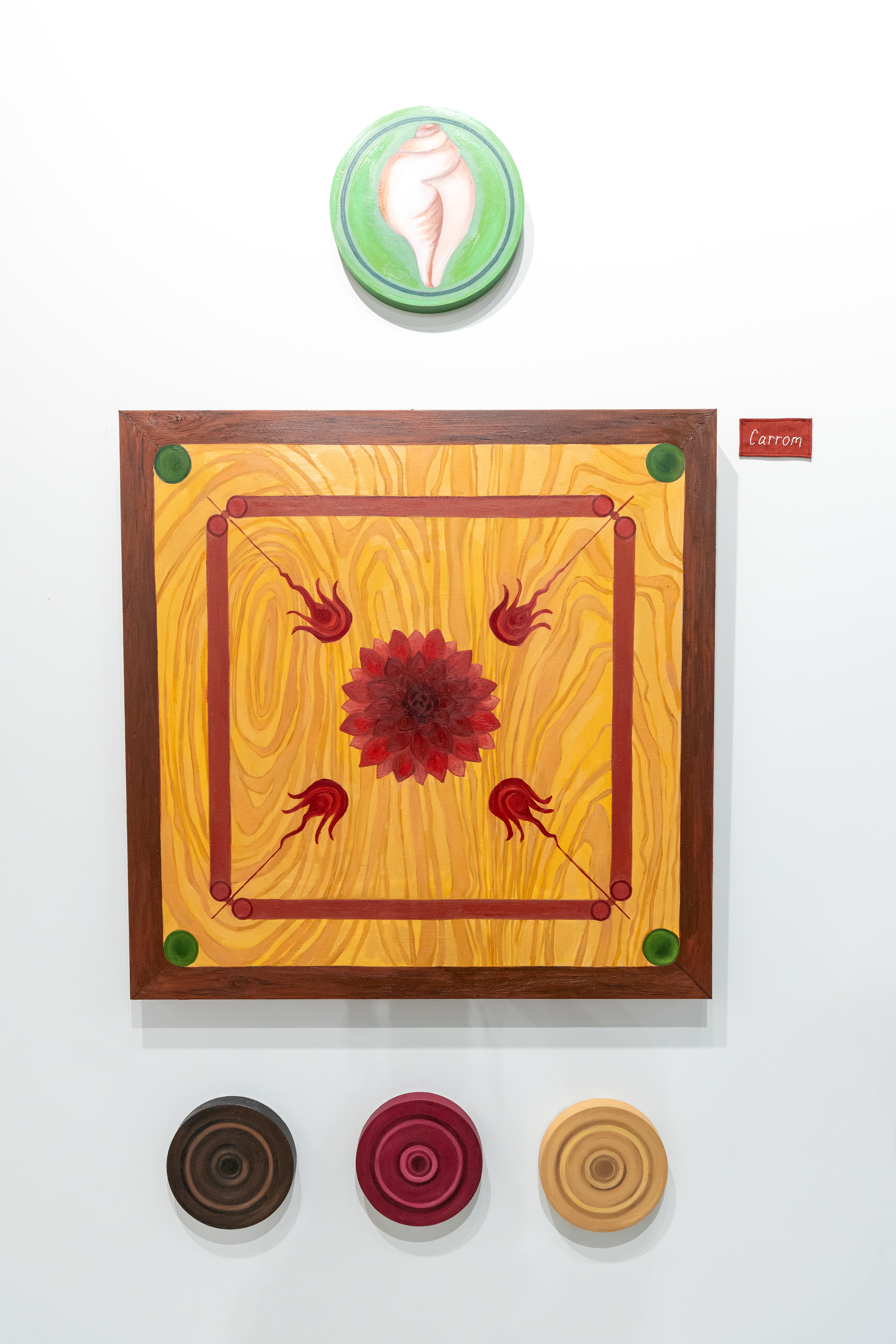 Carrom is an Indian board game, similar to Billiards, often played seated on the floor. Instead of a billiard cue, players use their hands in a flicking motion to place the pawns in one of the four pockets in the corners of the board. The red pawn symbolizes the Queen and is the most valuable pawn on the board. This version contains symbols that promote victory: fire (removing all hindrances), lotus (resilience) and the conch shell (prosperity).